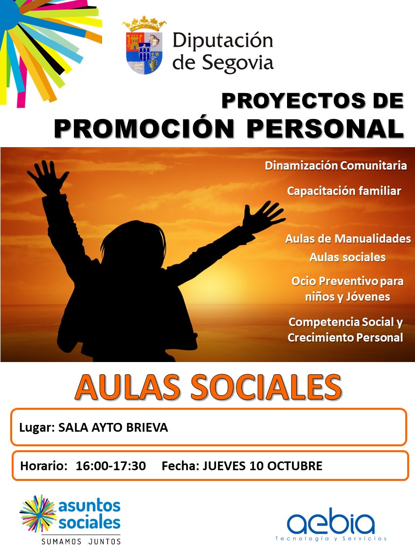 AULAS DE SOCIALES AULAS DE SOCIALES PROYECTOS DE PROMOCION PERSONAL. DIPUTACION DE SEGOVIA. SOCIALES JUEVES 10 de octubre 16:00 a 17:30 h, en el TELECLUB.