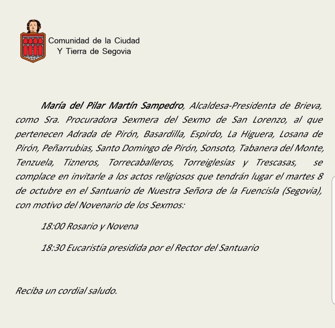 El martes día 8 de octubre estamos todos invitados a asistir a los actos religiosos que se celebrarán en el santuario de Nuestra Señora de la Fuencisla a las 6 de la tarde, dentro de la Novena de los Sexmos, por ser el día dedicado al Sexmo de San Lorenzo.